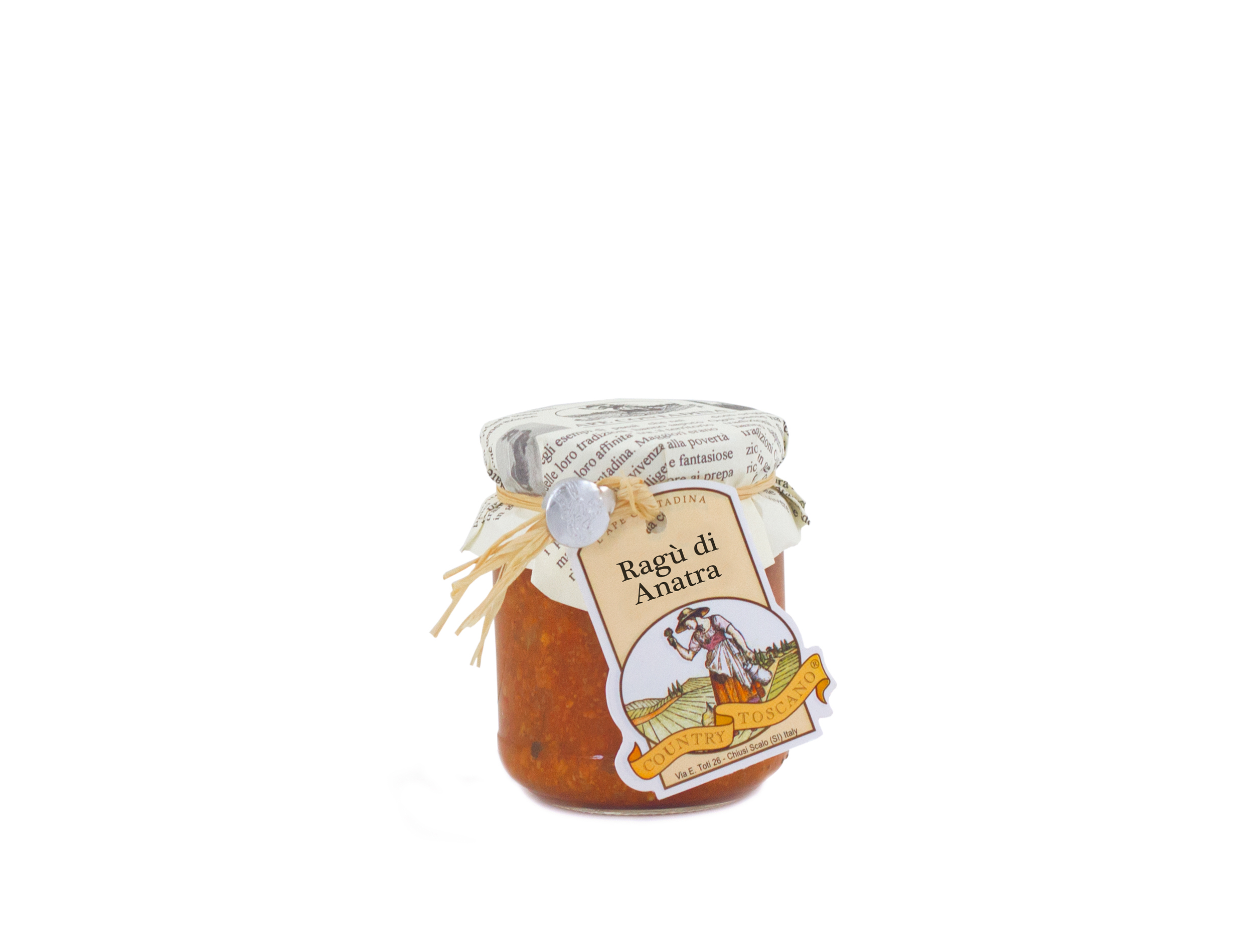 Carne di Anatra 43%, Pomodoro Cubettato, Cipolle, Olio Extravergine di Oliva, Carne di Tacchino, Sedano, Arance, Sale, Cognac, Vino Bianco (contiene Solfiti), Limoni, Aglio, Pepe, Salvia, Maggiorana.