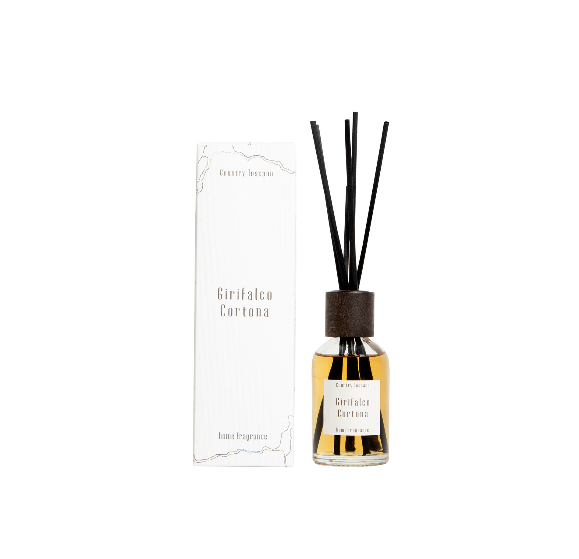 Confezione composta scatola, bottiglia da 100 ml con all’interno fragranza Girifalco Cortona e ventaglio di bastoncini.